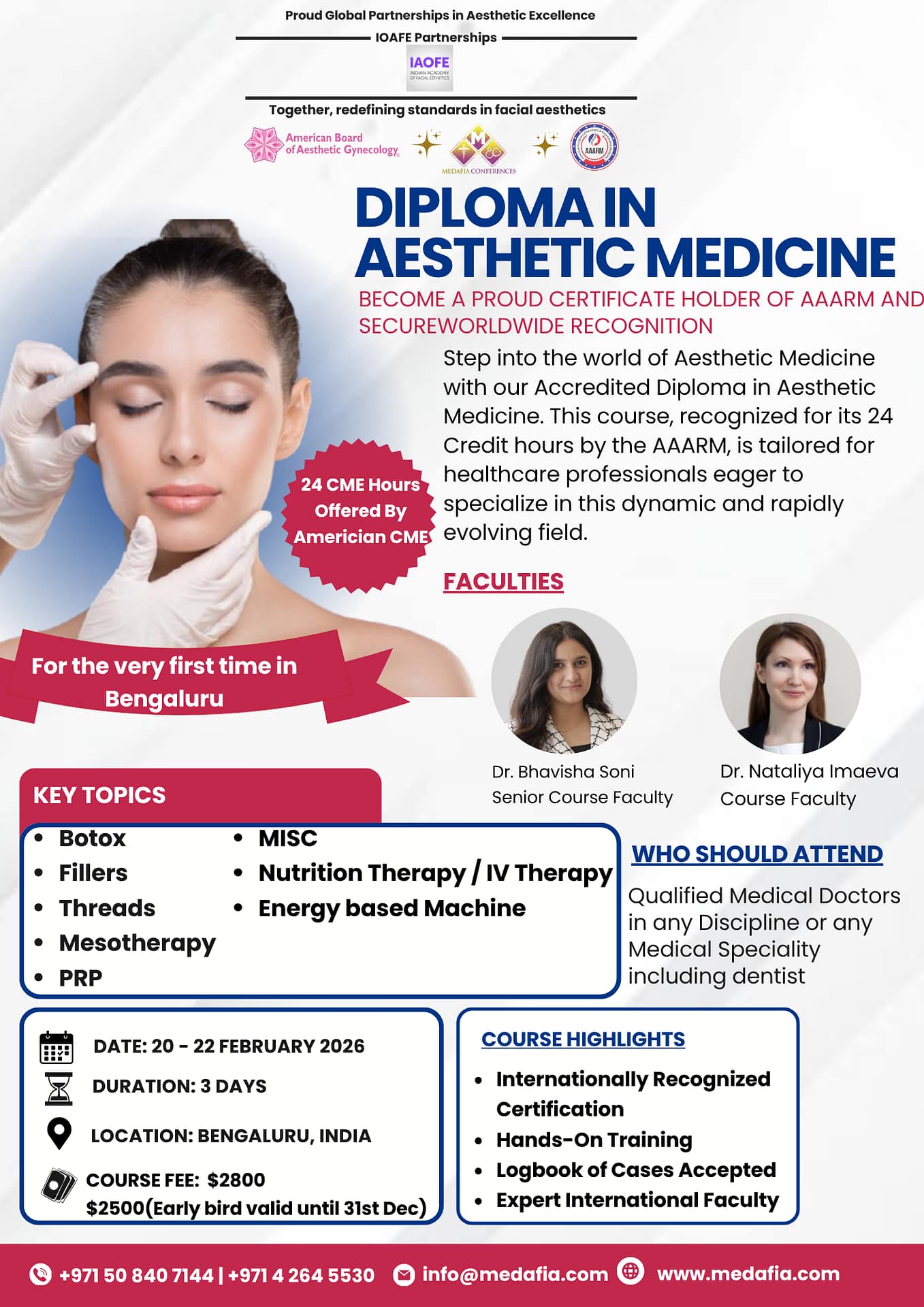• Step into the world of aesthetic medicine with our accredited Diploma in Aesthetic Medicine. This course, recognized for its 24 Credit hours by the AAARM, is tailored for healthcare professionals eager to specialize in this dynamic and rapidly evolving field. Whether you are a doctor, nurse, or a medical practitioner, this course provides a robust foundation and advanced knowledge in aesthetic medicine.